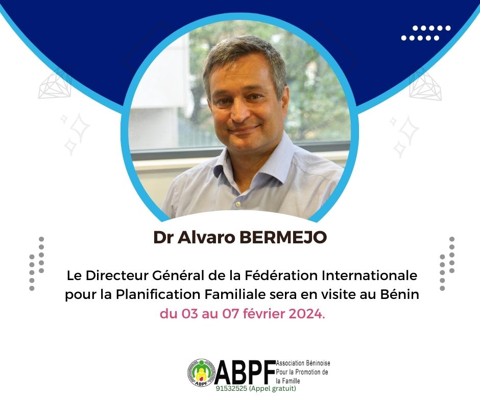 Cotonou, 31 janvier 2024 - Dr Alvaro BERMEJO, Directeur Général de la Fédération Internationale pour la Planification Familiale sera en visite au Bénin du 03 au 07 février 2024. Il sera accompagné de Madame Marie Evelyne PETRUS – BARRY, la Directrice Régionale de l'IPPF Région Afrique.